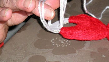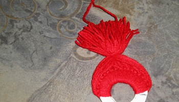 Angefangen wird am besten mit den roten Fäden. Es werden soviel Fäden geknüpft, dass etwas mehr als die Hälfte des Papprings damit bedeckt ist. Durch die größere Länge der roten Fäden wird damit eine „Mützenbommel“ und die Aufhängeschlaufe hergestellt.