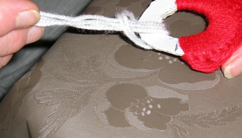 Wenn alles fertig ist, nimmt man ein etwas längeren Faden, der dann so kurz wie möglich über dem Ring verknotet wird. Die beiden Enden werden verknotet und ergeben die Schlaufe zum Aufhängen.