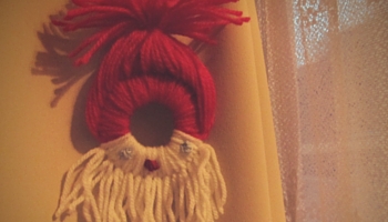Fehlt nur noch das Gesicht. Augen und Nase werden mit einer Stopfnadel und mit verschiedenfarbigen Stopfgarn auf die Fläche mit den weißen Wollfäden angebracht. Auch hier sind der Fantasie keine Grenzen gesetzt.